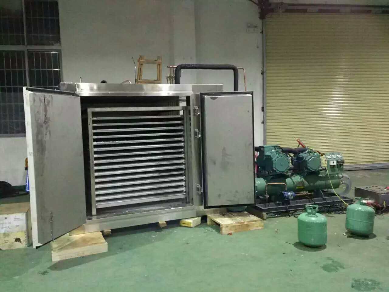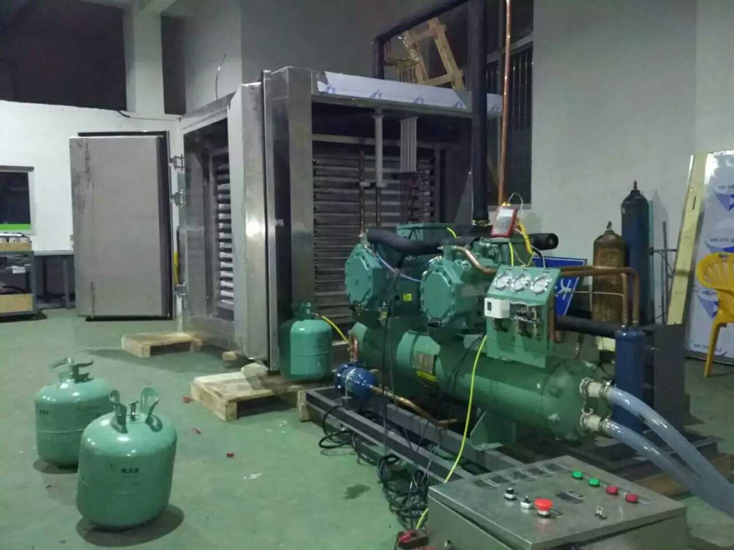 冷庫(kù)工程名稱(chēng): 一體化速凍冷庫(kù) 冷庫(kù)設(shè)計(jì)要求: 速凍量:1000KG/8小時(shí);速凍溫度:-35度至-40度 機(jī)組品牌及匹數(shù): 北京比澤爾、30HP 庫(kù)內(nèi)蒸發(fā)器: 擱架式速凍鋁平板 應(yīng)用范圍: 海鮮加工,食品廠(chǎng)速凍等行業(yè)